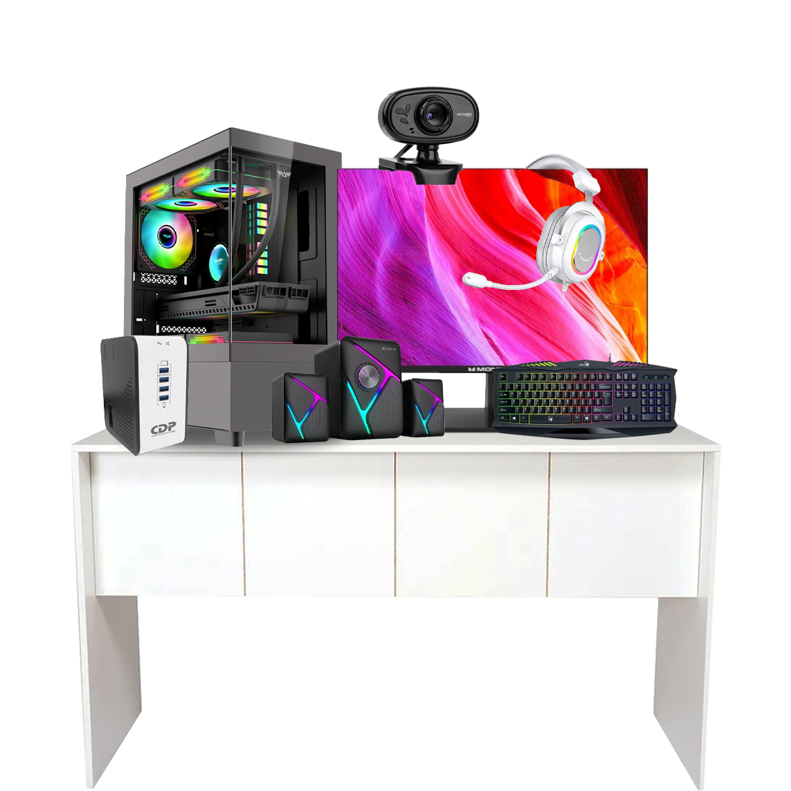 [AR-AQ-I3-12100-16-512-GIGA] CPU GAMER ARMAGGEDDON CORE I3-12100-RAM 16GB SSD 512GB TARJETA DE VIDEO 2GB 2 COOLER 1 COMANDO ARGB GIGABITE[MTK9700] MONITOR MONSTER MTK9700 24 PLGDA LED HDMI IPS VGA FHD[091163251453] TECLADO GENIUS K220 GAMING SCORPION USB NEGRO[8886411983116] MOUSE ARMAGGEDDON GAMER TEXTRON SCORPION 3 CPI 4800[6932391926437] PARLANTES XTRIKE ME SK-610 MULTIMEDIA 2.1 RGB 3.5MM USB[FIFINE-H3-BLANCO] AUDIFONOS FIFINE H3 BLANCO RGB CON MICROFONO PARA JUEGOS PS4/PS5/PC/MAC/XBOX/SWITCH[879071000215] REGULADOR CDP R2CU-AVR 1008 500W 8 TOMA AUTOMATICO[886540007217] CAMARA WEB ARGOM TECH ARG-WC-9120BK A00530 USB HD 720P NEGRA[4897098683446] ADAPTADOR TP-LINK BLUETOOTH 5.0 UB500 NANO USB[798302060883] MOUSE PAD KLIP XTREME KMP-100B NEGRO[F.00664.039] ESCRITORIO EL BOSQUE CUBIC 1360 F.00664.039 BLANCO