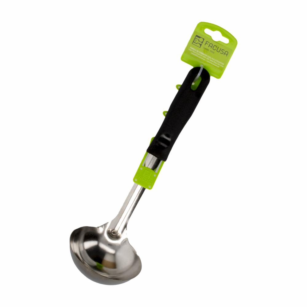 - El Cucharón Chico con Mango de Plástico en Color Negro de FACUSA es una herramienta esencial en la cocina, diseñada para manipular y servir una variedad de líquidos y alimentos con precisión y facilidad. Con su diseño específico y funcionalidad, este cucharón garantiza un manejo seguro y eficiente en diversas tareas culinarias