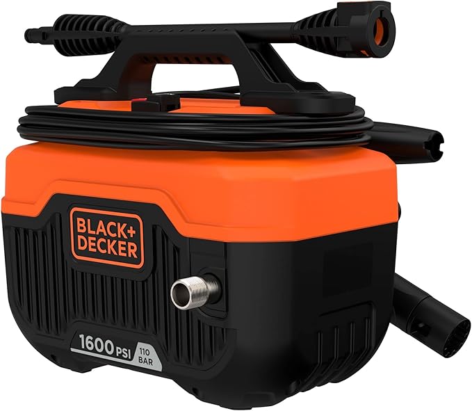 Acerca de este artículoSu presión máxima de 1600 PSI (110 Bar) hace que la limpieza de patios, paredes, ventanas, muebles, bicicletas, motos y coches sea fácil y rápida.Su función de autoaspirado le permite utilizar agua de cualquier fuente: un cubo, un lago o una piscina. -También es muy útil cuando se tiene muy poca presión en el sistema de suministro de agua.Con su almacenamiento a bordo de los accesorios, incluyendo la manguera y el cable de alimentación, es fácil de transportar y almacenar.La boquilla turbo adicional proporciona una anchura de limpieza 5 veces mayor, lo que permite obtener resultados de limpieza más rápidos.Esta hidrolavadora compacta y que ahorra espacio de Black+Decker es todo lo que necesita para completar la mayoría de las tareas de limpieza en su hogar, ya sea una casa o un apartamento con poco espacio de almacenamiento.