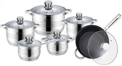 Este completo set de cocina incluye 12 piezas fabricadas en acero inoxidable, con tapas de vidrio resistentes al calor. Compatible con cocinas de inducción.