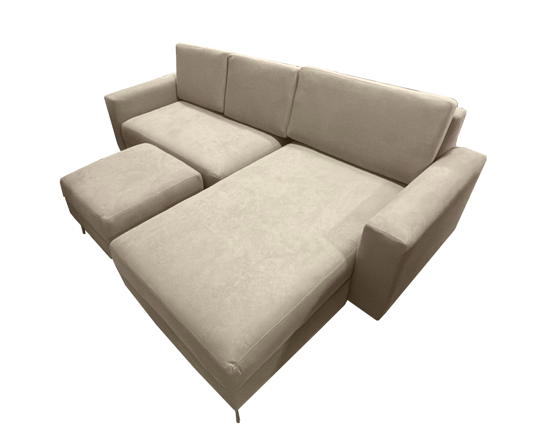 Sofá seccional en elegante tono beige con diseño minimalista y contemporáneo. Cuenta con chaise longue amplia y cómoda, ideal para relajarse, además de un puff independiente que complementa el conjunto. La tapicería neutra se adapta fácilmente a cualquier estilo decorativo. Diseño funcional con líneas rectas y limpias que aporta sofisticación sin perder la comodidad. Los cojines del respaldo son removibles para mayor versatilidad y mantenimiento. Perfecto para espacios modernos que buscan un mueble versátil y atemporal que combine estilo y funcionalidad en tonos neutros que nunca pasan de moda.