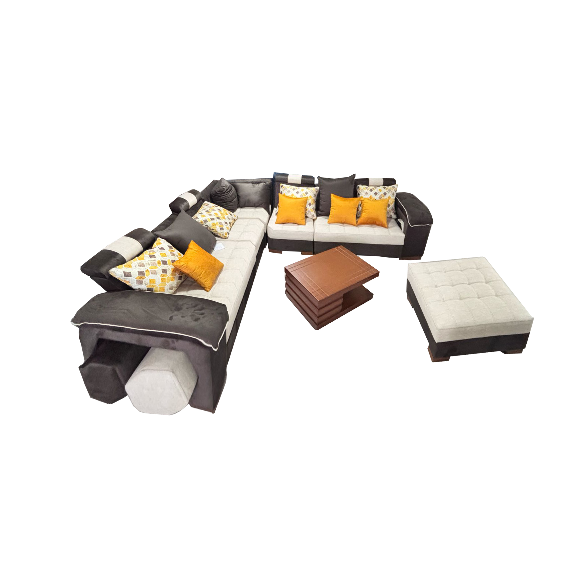 Este conjunto modular ofrece una experiencia completa con su amplia sala esquinera de contrastes en blanco y marrón, complementada por acentos vibrantes en amarillo. La versatilidad es su mayor virtud, incluyendo cuatro pufs adicionales que transforman el espacio según las necesidades del momento. La mesa central en madera aporta calidez al conjunto, mientras que la distribución abierta invita al diálogo y la conexión. Ideal para quienes buscan un ambiente flexible donde se fusionan estilo contemporáneo y funcionalidad, adaptándose a diferentes momentos y actividades familiares.