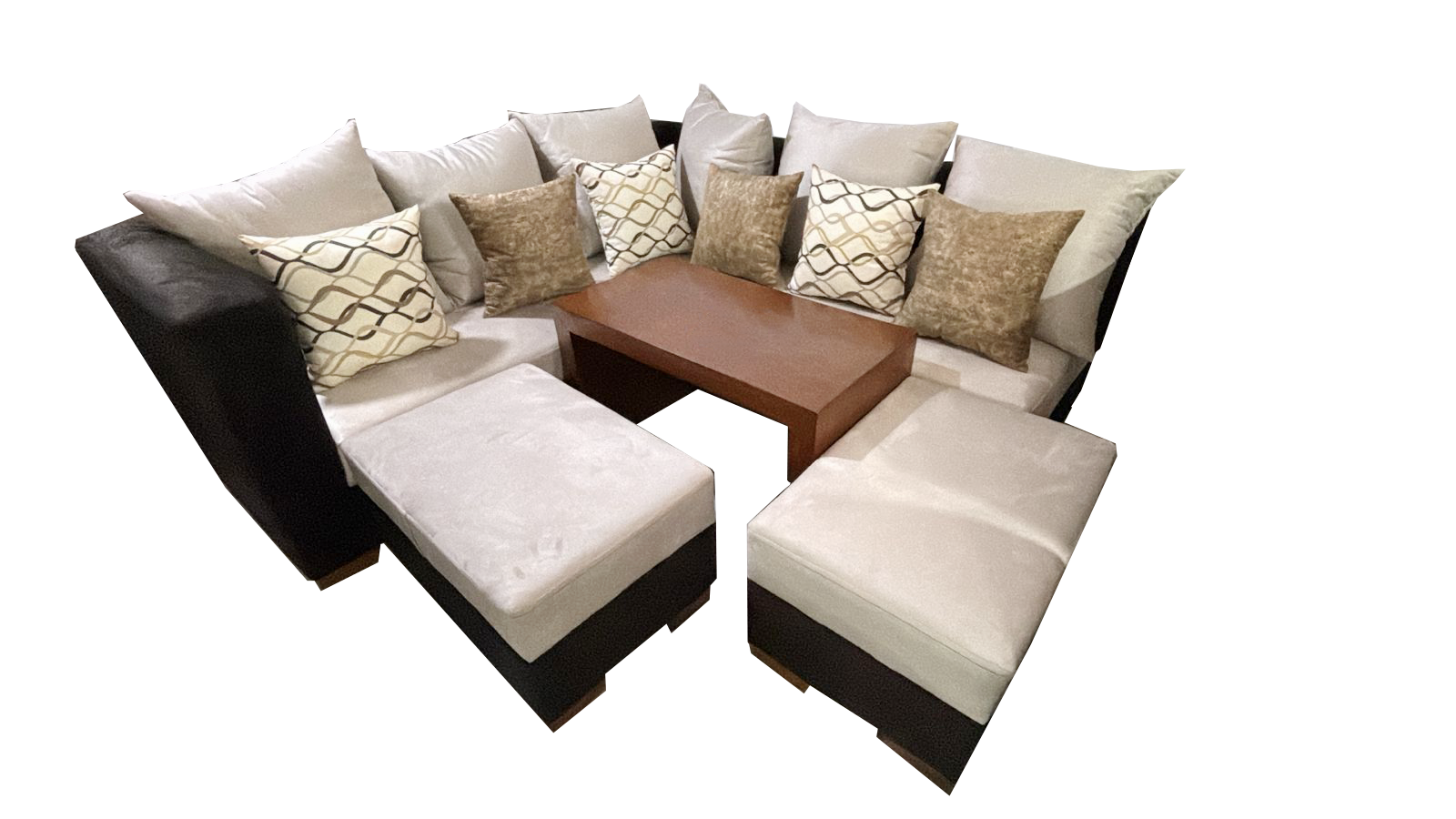 Diseño moderno con contraste marcado entre la base oscura y los cojines claros que crea profundidad visual. La generosa cantidad de cojines aporta comodidad y estilo personalizable. Ideal para salas contemporáneas que buscan un look sofisticado con contraste de colores y múltiples opciones de asiento.